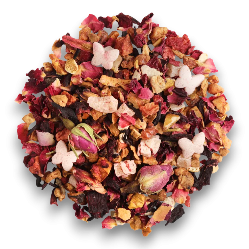 Morceaux de pomme 34,1%, morceaux d’ananas (ananas, sucre) 15%, hibiscus 15%, écorces d’orange 10%, papillons en sucre (sucre, farine de riz, huile de colza totalement hydrogénée, épaississant : gomme adragante, arôme) 7%, boutons de rose 4,5%, pétales de rose 4%, arômes, morceaux de fraise, morceaux de canneberge (2,4%), framboises (2%).