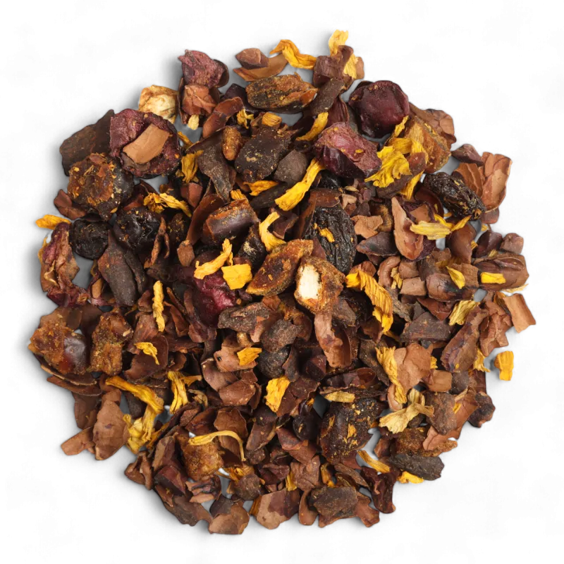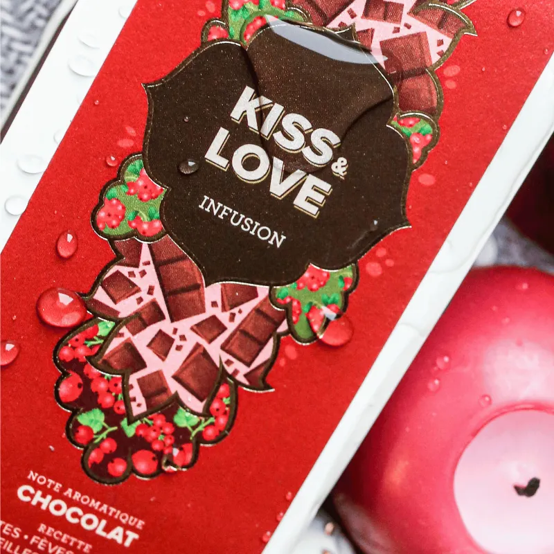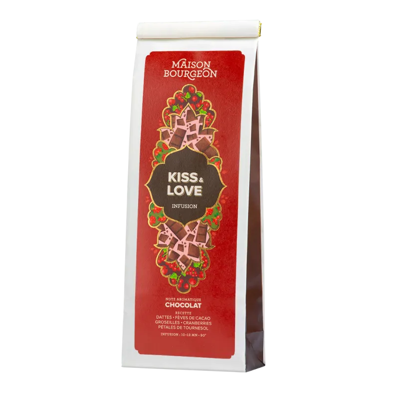 Avec l’infusion au chocolat Kiss & Love, ressentez la douceur du chocolat et la passion des fruits rouges, sans théine !