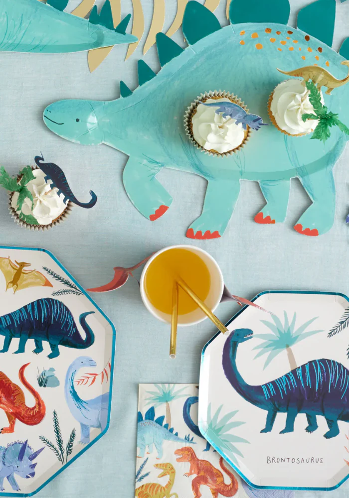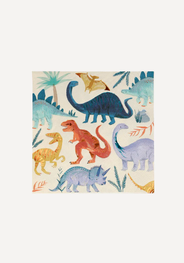 Caractéristiques : Lot de 16 serviettes en papier Motifs de dinosaures multicolores Détails métallisés cuivre et vert Dimensions pliées : 16,5 x 16,5 cm