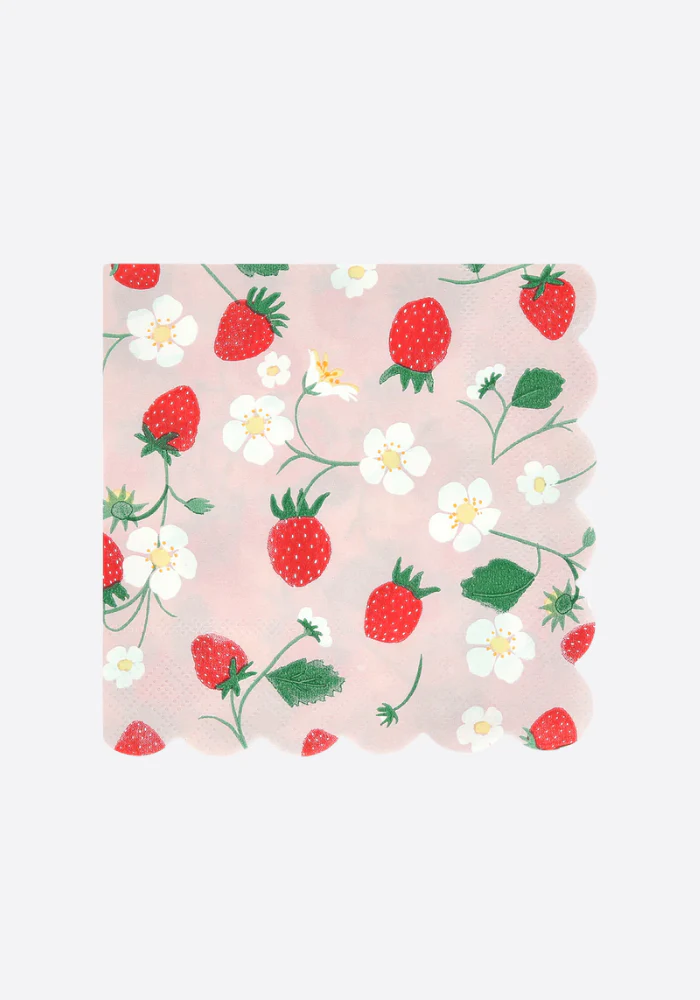 Lot de 16 serviettes carrés en papier décorées de motifs de fraises rouges avec des bords arrondis.