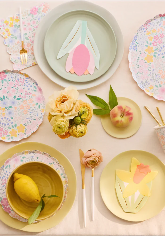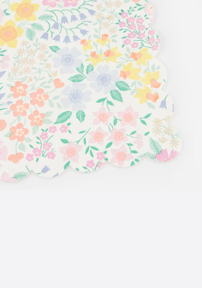 Lot de 16 assiettes carré en papier décorées de motifs de fleuris avec les bords festonnés.