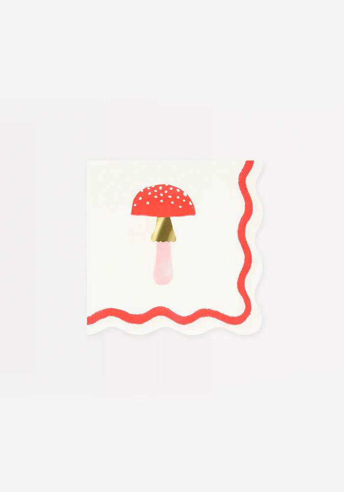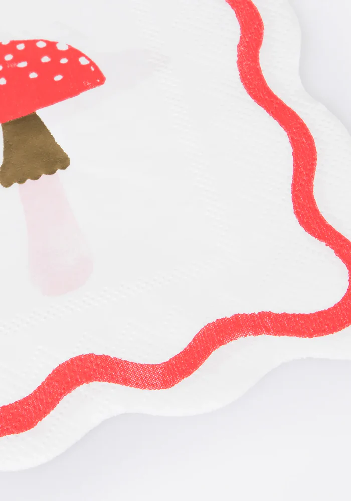 Lot de 16 serviettes petit modèle décorées de champignons et dorures.