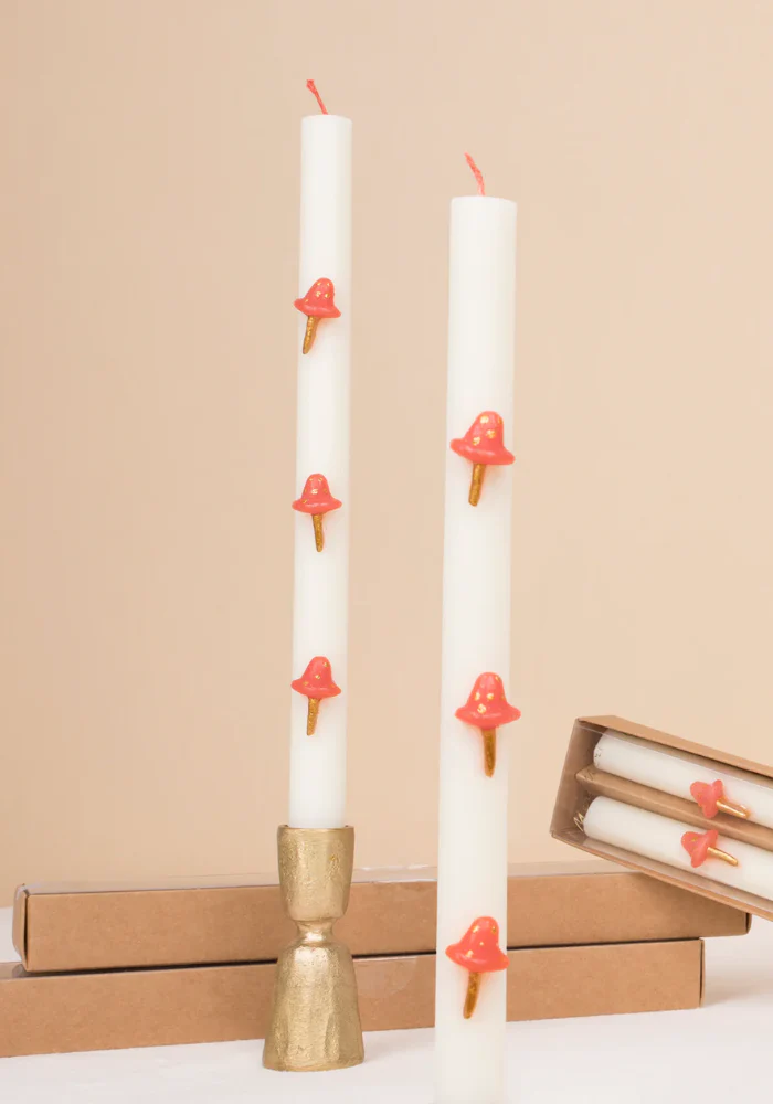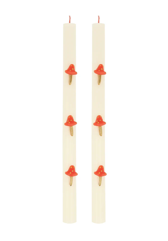 Lot de deux bougies cierges blanches avec des décorations en forme de champignons rouges et dorés.