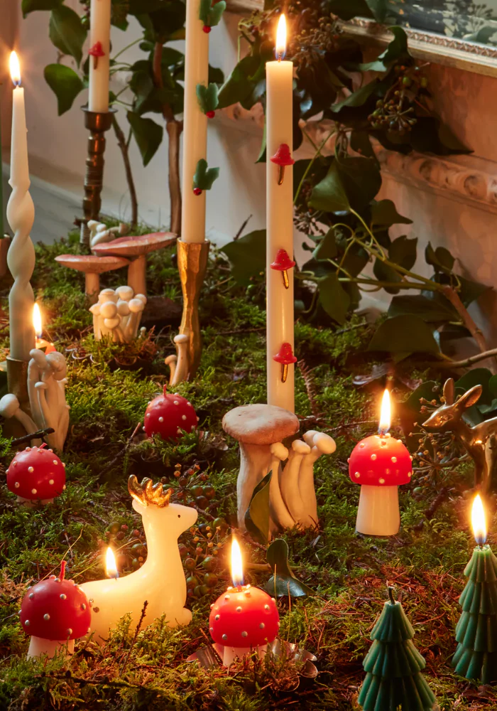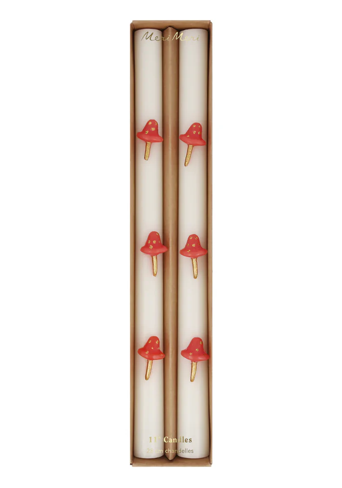Lot de deux bougies cierges blanches avec des décorations en forme de champignons rouges et dorés. Caractéristiques : Lot de 2 bougies de cire Hauteur : 27,9 cm Durée de combustion : environ 6 heures Décoration champignons en cire rouge et dorée Peintes à la main Mèches rouges Non parfumé
