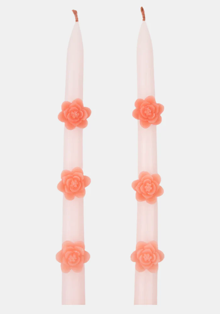 Lot de 2 bougies en cierges avec des fleurs en 3d dans les tons pêche et rose.