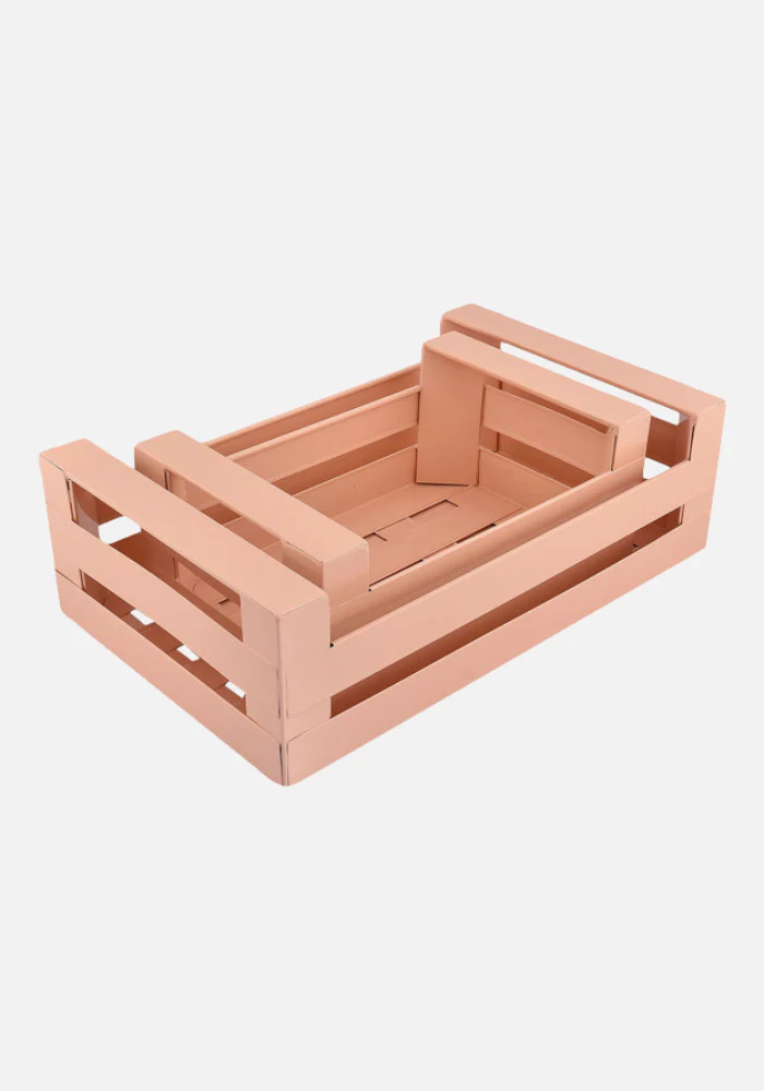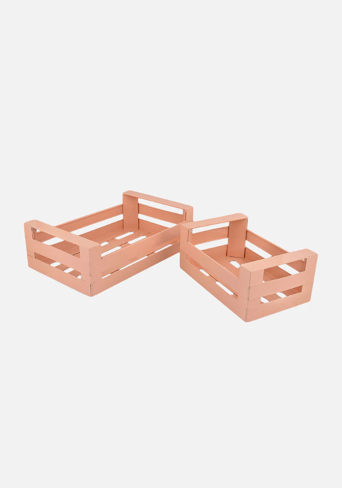 Set de deux cagettes en métal coloré rose. Une grande taille (40 × 25 × 12 cm) et une petite taille (29 × 19 × 12 cm).