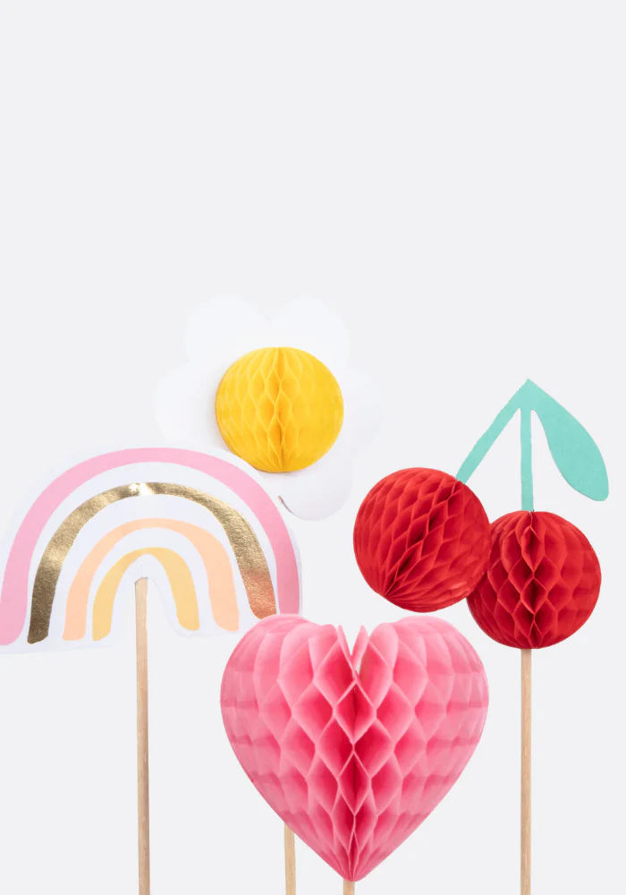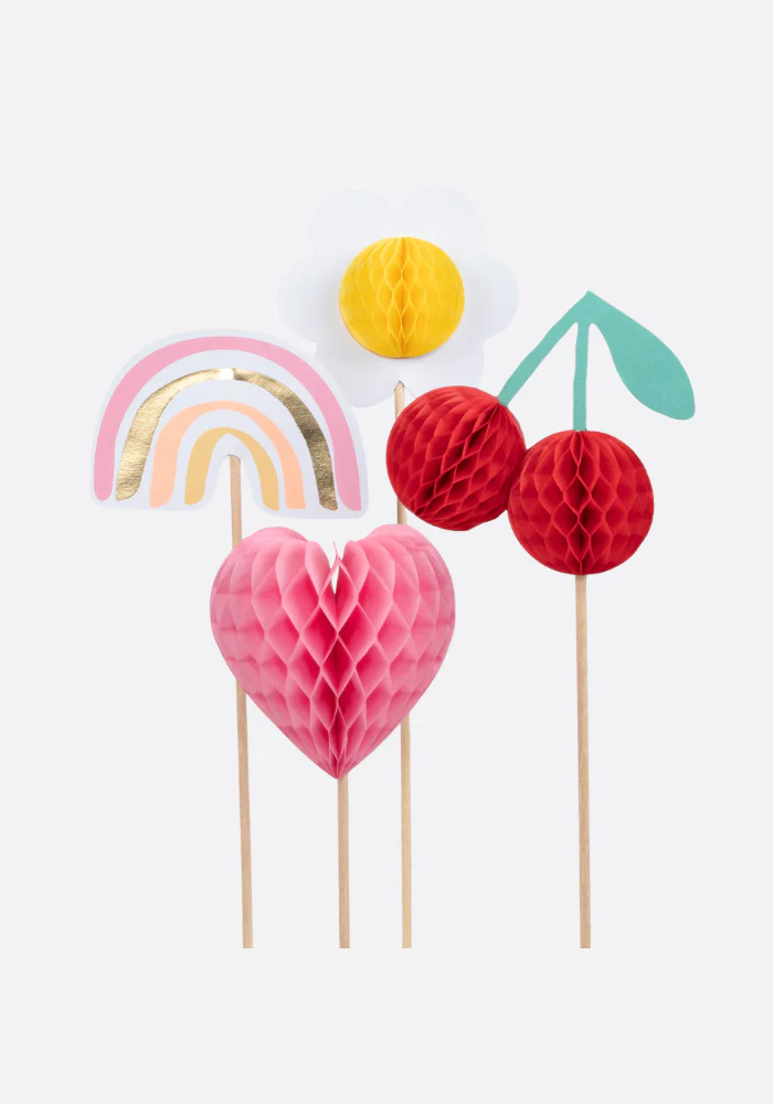 Lot de 4 piques en bambou naturels avec des décorations en nid d’abeille arc en ciel, coeur, fleurs et cerise.