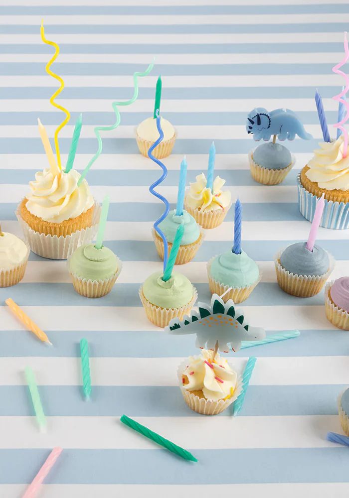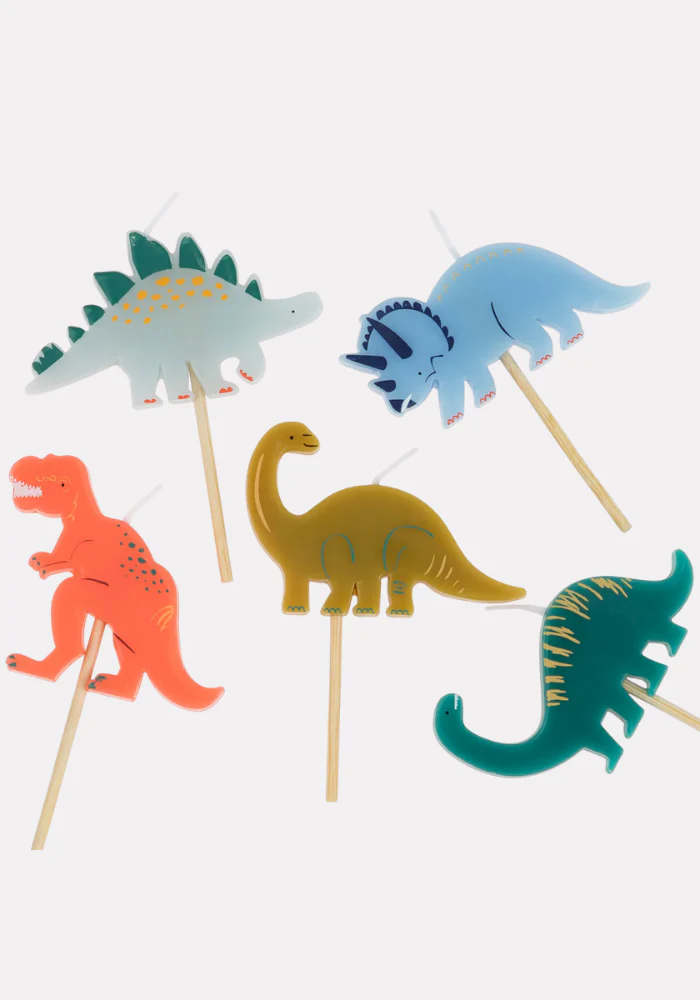 - 5 bougies en forme de dinosaures (Stégosaure, Brachiosaure, T-Rex, Diplodocus, Tricératops)