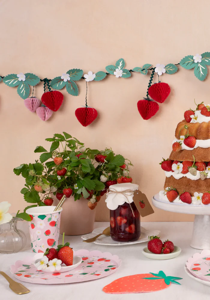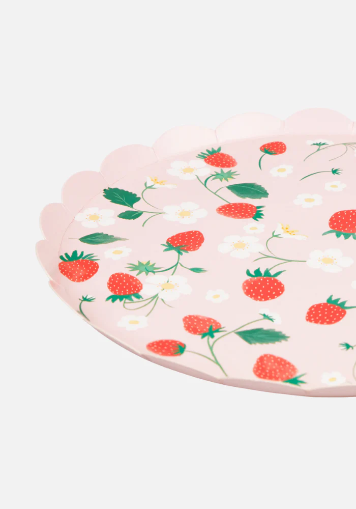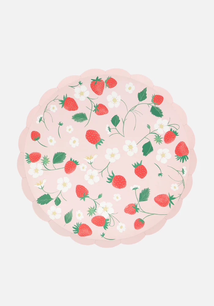 Lot de 8 assiettes rondes en papier décorées de motifs de fraises rouges et de fleurs blanches.