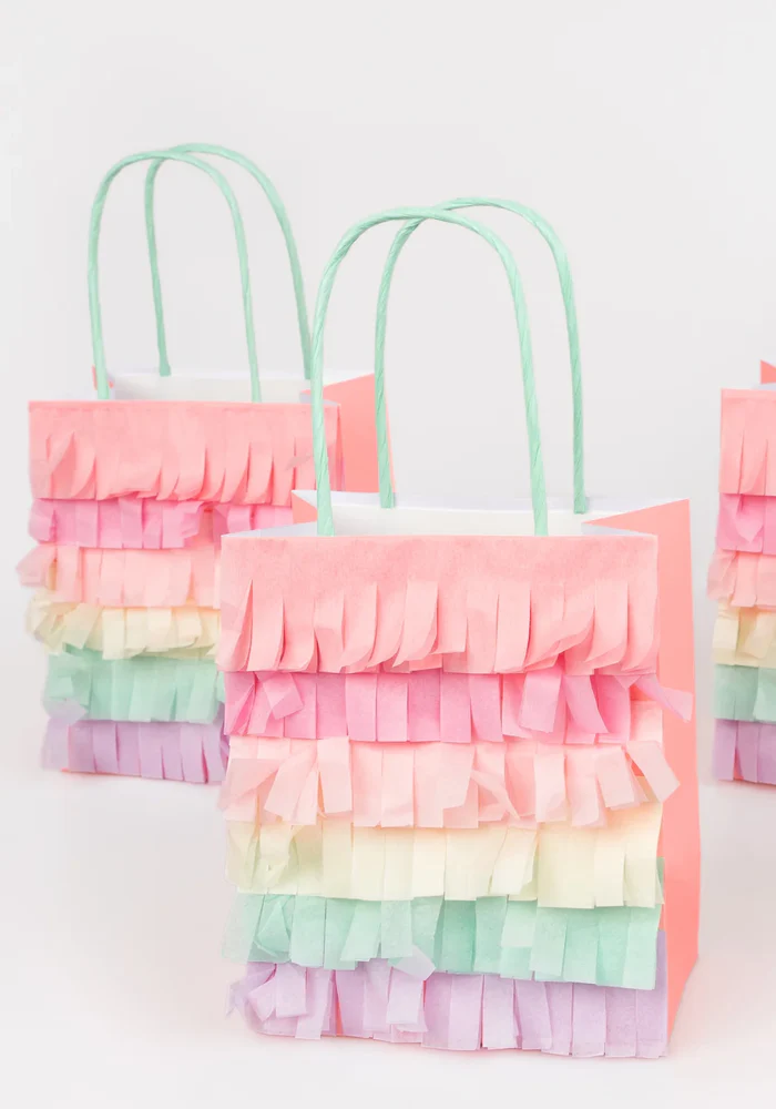 - Franges en papier de soie sur le devant des sacs en corail, rose, rose clair, jaune, menthe et lilas