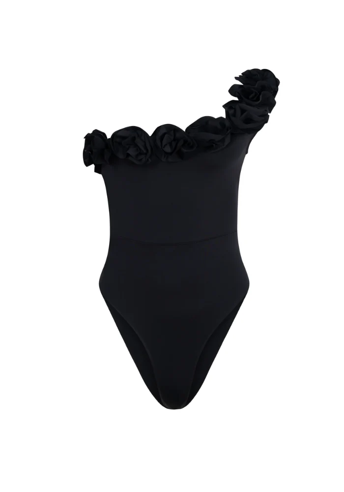 - Ce modèle asymétrique, soigneusement orné de fleurs crème cousues une à une, offre une esthétique résolument féminine, mêlant sophistication et audace.