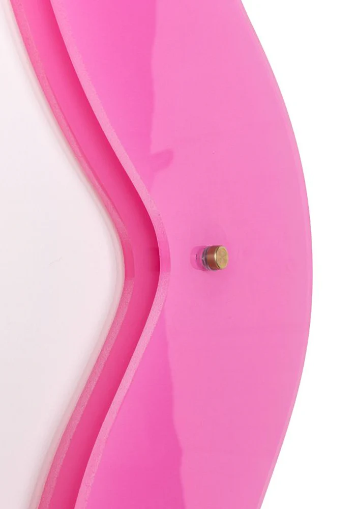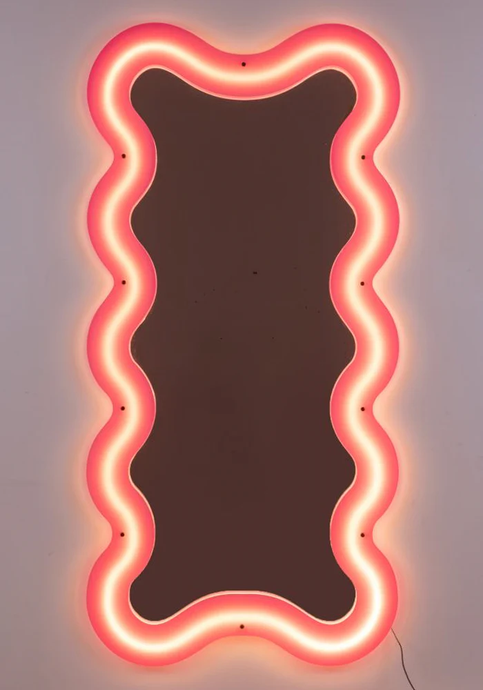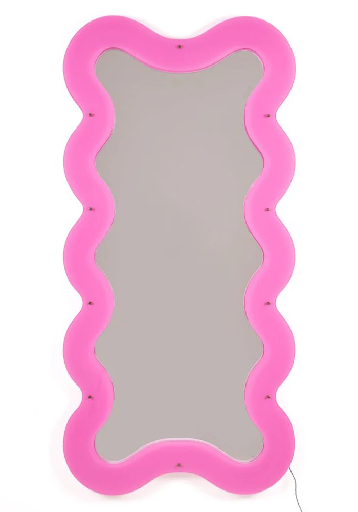 Miroir supercurve grand modèle avec les bordes en plexiglass rose fluo ondulé et traversés d’une lumière LED.
