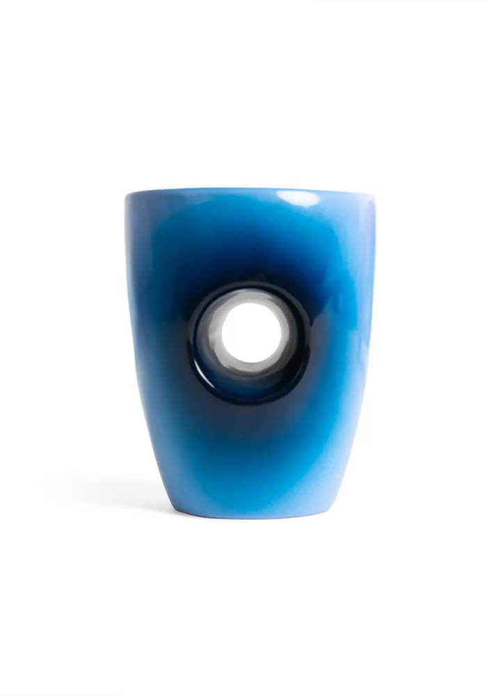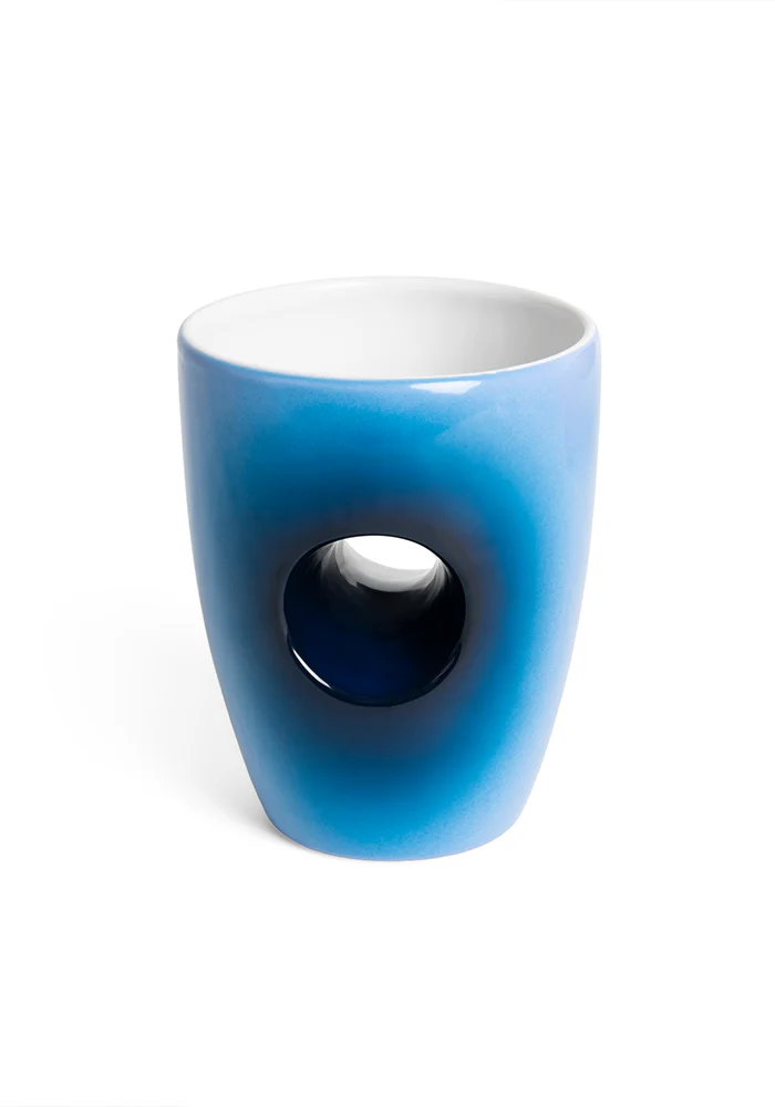 Mug chauffe-main bleu avec un trou au centre et un dégradé.