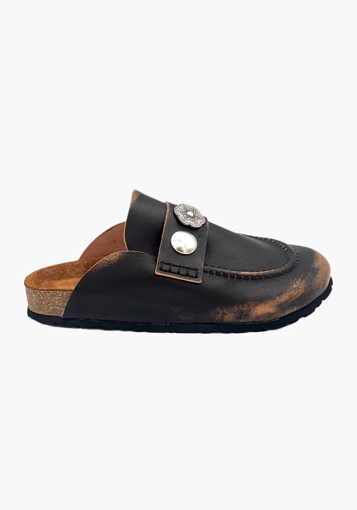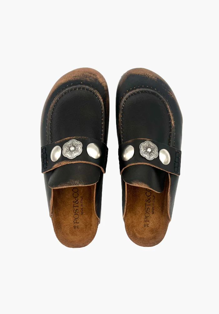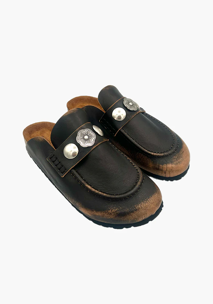 Mules en croute de cuir Himalaya marron foncé délavé avec des cabochons en métal argentés.