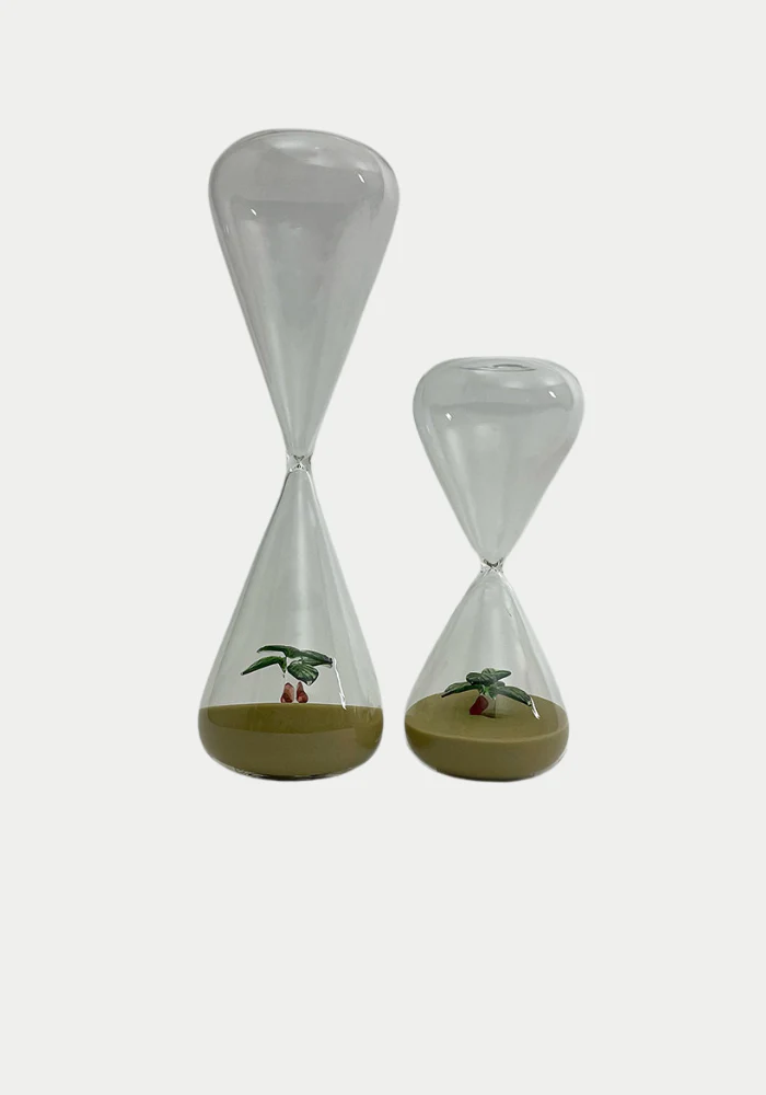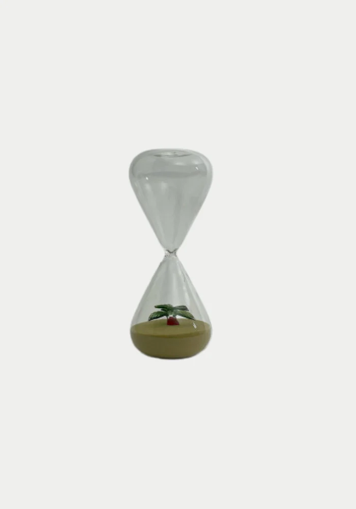 Petit sablier Sahara en verre transparent avec du sable couleur désert et un petit décor de palmier à l’intérieur, évoquant une oasis miniature.