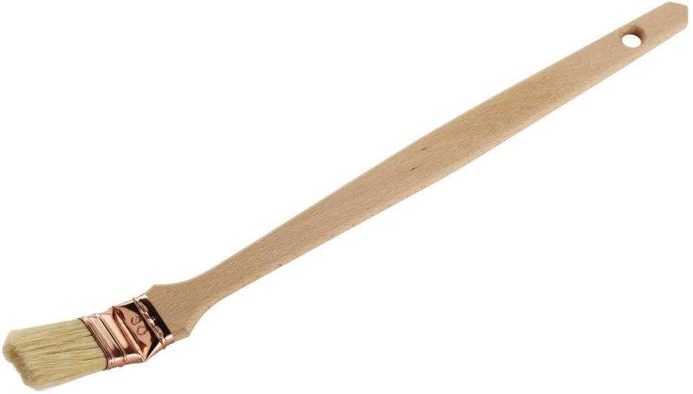 Pinceau brosse à virole cuivrée coudée, poils blonds en soie naturelle et mange en bois poncé.