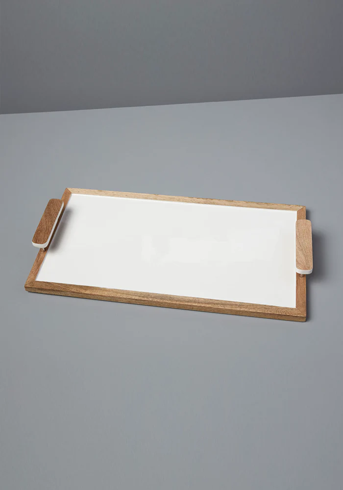 Plateau rectangulaire Madras avec deux poignées, en bois de manguier et émail blanc.