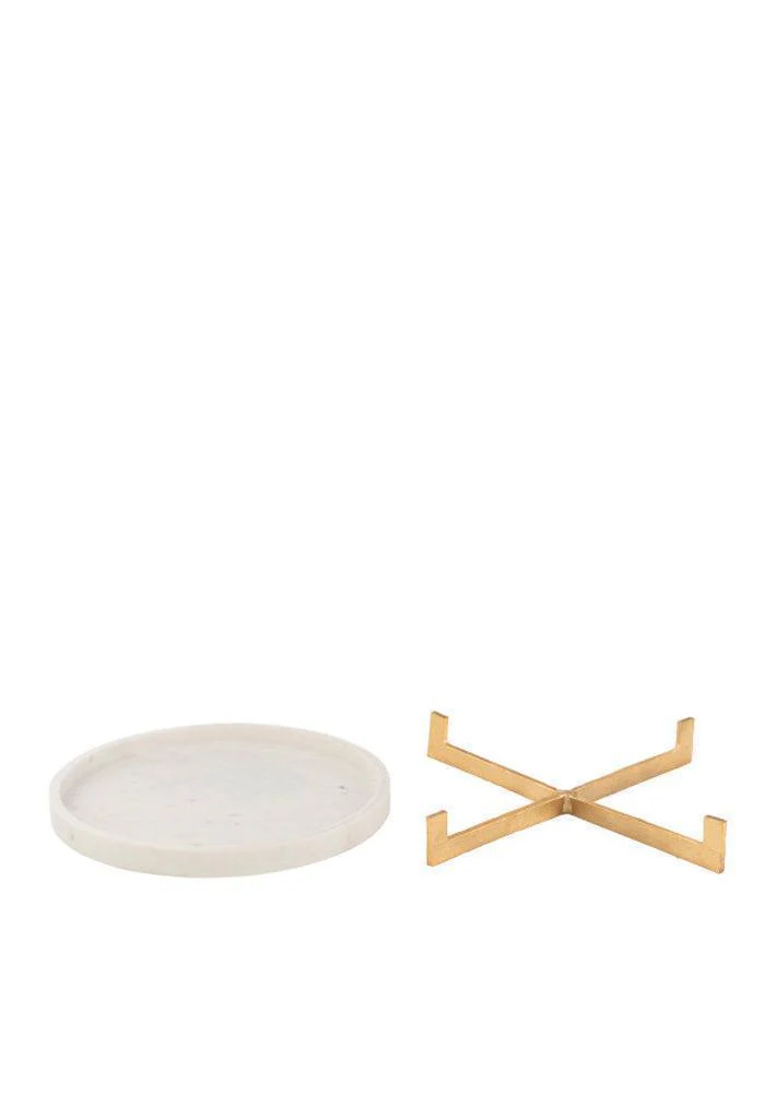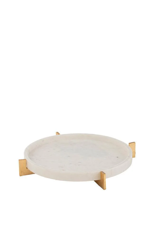 Plateau Rond en Marbre Blanc avec Support et 4 Pieds Dorés.
