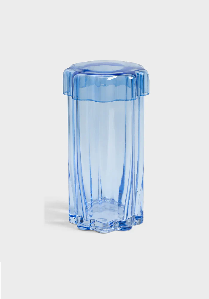 Boite astral en verre transparent bleu. Caractéristiques : Matière : Verre pulverisé Couleur : Bleu Dimensions : 21 x Ø 11 cm Entretien : Essuyez avec un chiffon humide pour le nettoyage
