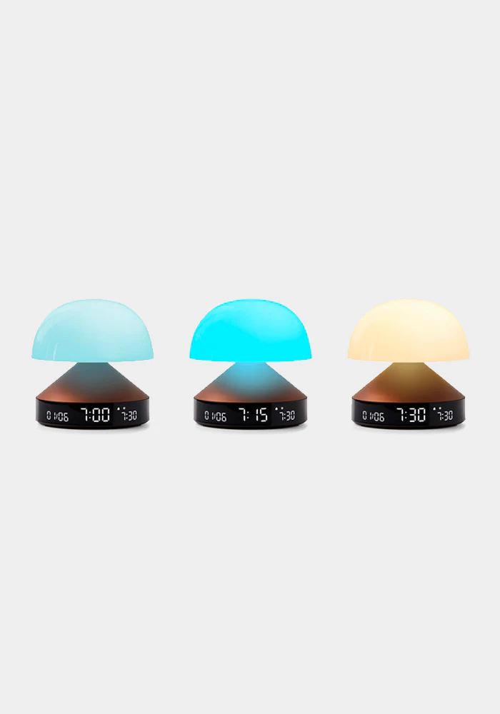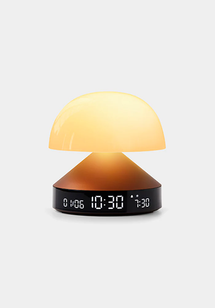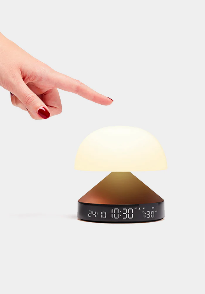 Réveil Mina Sunrise avec une lampe et un effet simulateur d’aube. Ce réveil possède un écran LCD noir tactile et 5 mélodies et sons naturels pour vous réveiller en douceur.