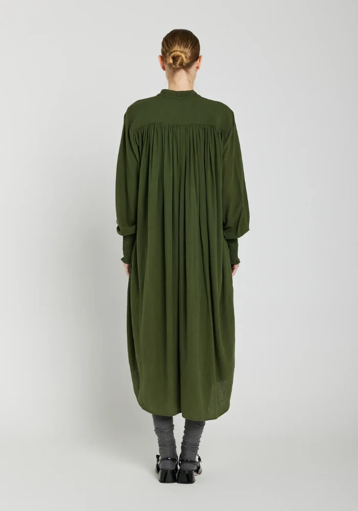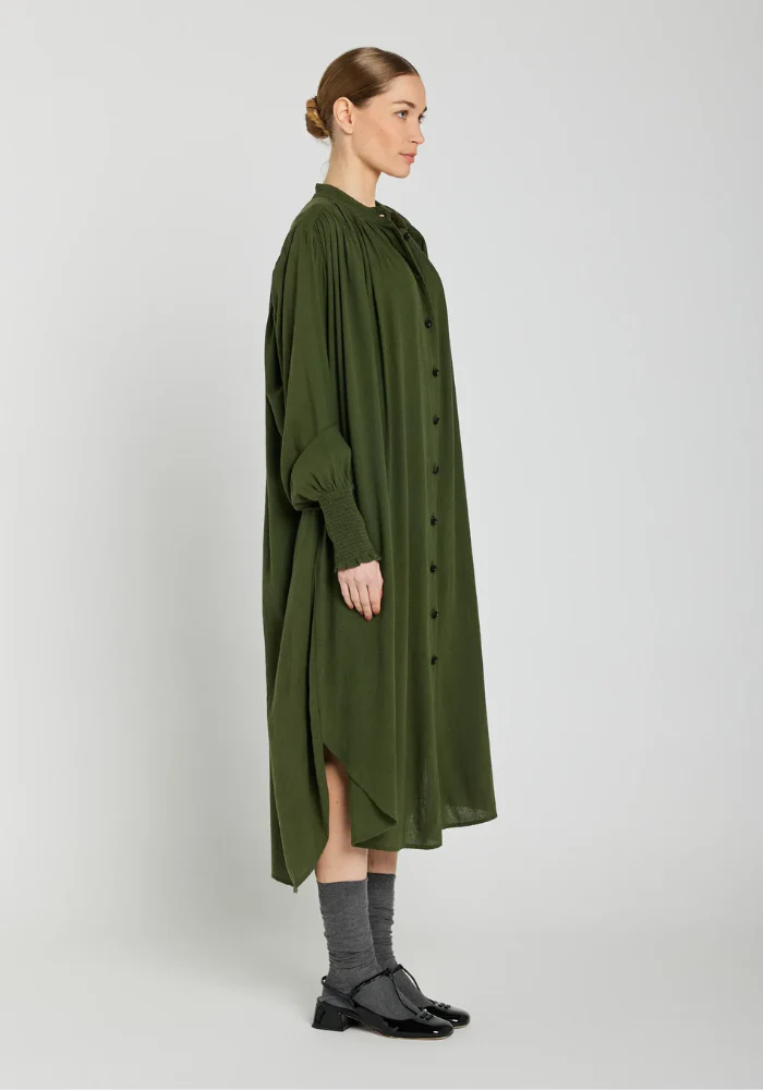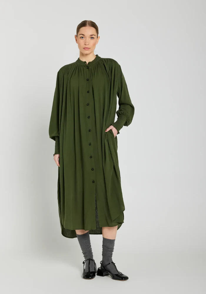 La robe olive Cesar en bourette de soie séduit par sa silhouette évasée, son col mao délicat et ses manches froncées. Ses boutons perlés et ses poches en font une pièce élégante et intemporelle.