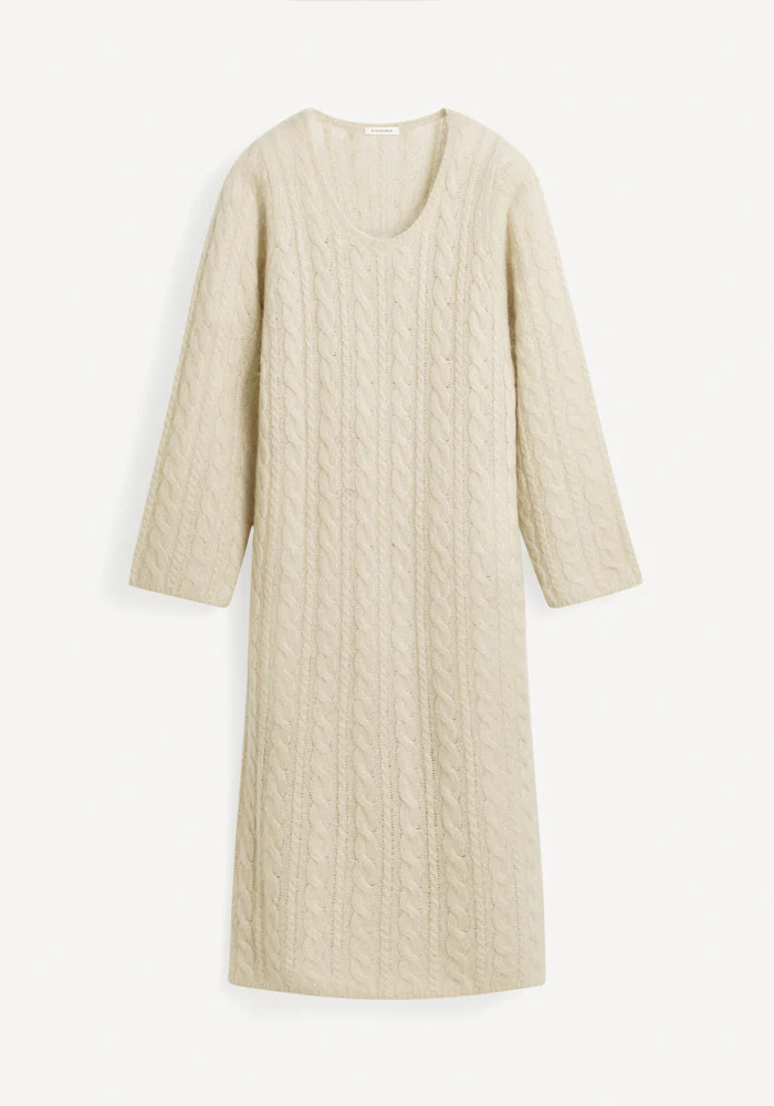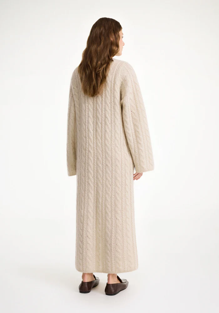 Robe longue Lovella beige en mailles torsadées longues avec un col rond.