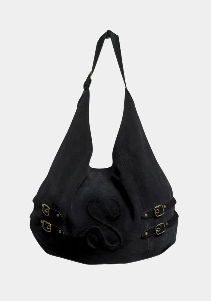 Sac Lily en nubuck noir avec 4 sangles sur les côtés et une anse en daim.