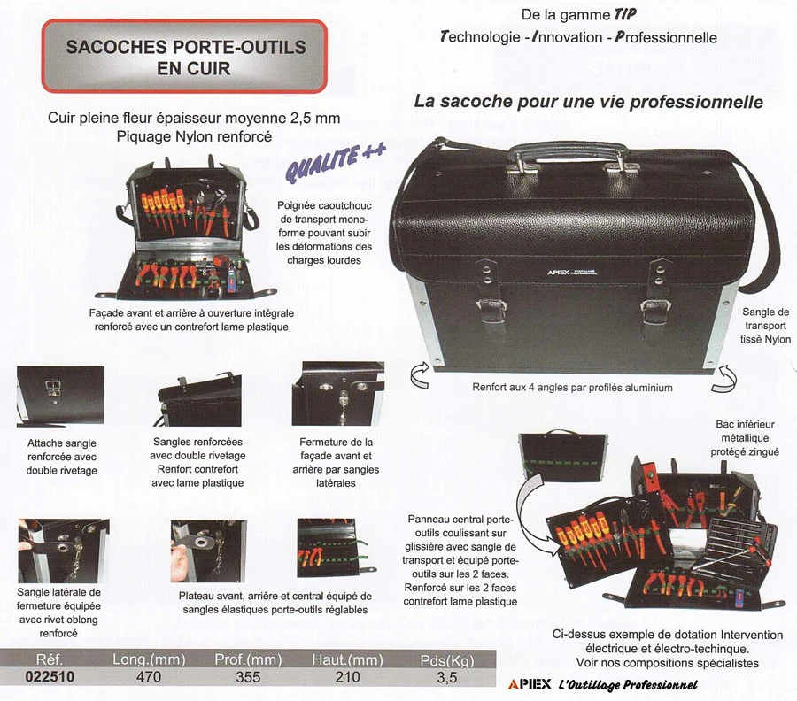 Sacoche porte outils 470 x 355 x 210 mm en cuir pleine fleur Cuir pleine fleur épaisseur moyenne 2,5 mm ; Piquage Nylon renforcé ; QUALITE PLUS : La sacoche pour une vie Longueur : 470 mm x Profondeur : 355 mm x Hauteur : 210 mmPoids : 3,5 kg Façades avant et arrière à […]