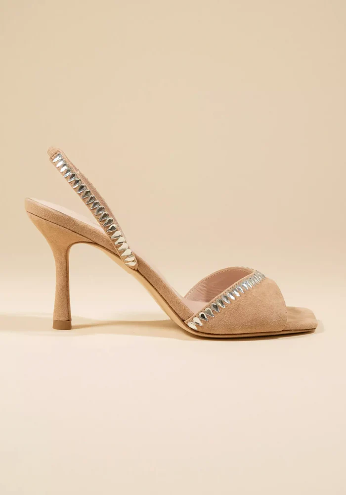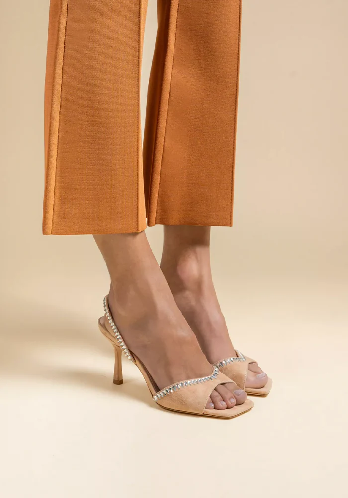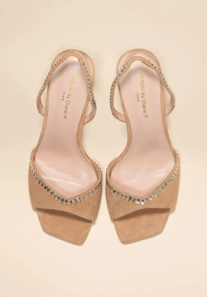 Sandales Crystal à talon avec le bout carré et une bride passant derrière le pied et une autre sur le devant pavé de cristaux gouttes. Cette chaussure a été imaginée Diane Perreau.
