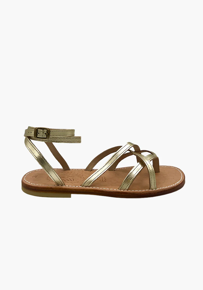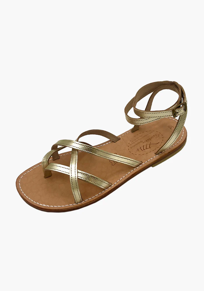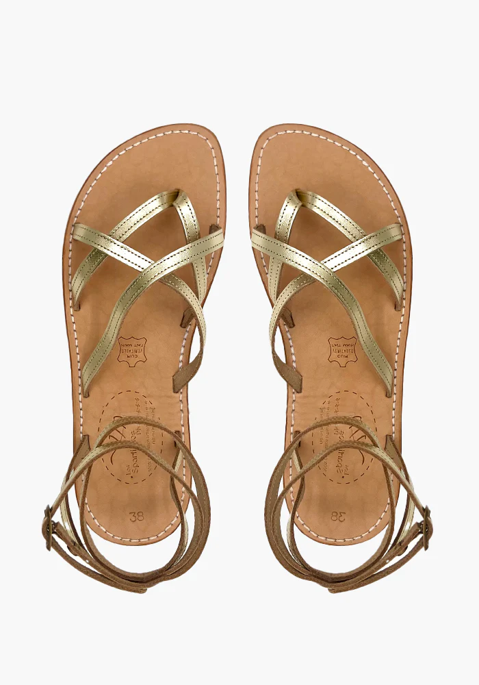 Sandales Linda avec 4 brides fines sur le pieds qui se croisent et deux brides qui s’enroulent autour de la cheville.