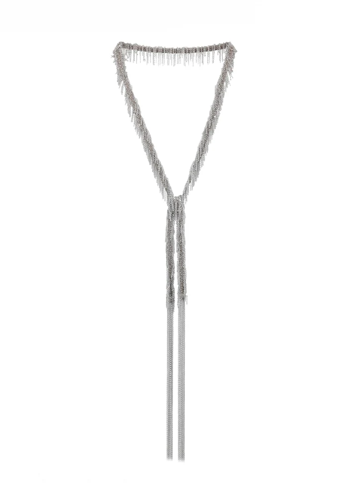 Sautoir 1C003 à nouer en laiton avec des chaines brodées sur un ruban gris clair.