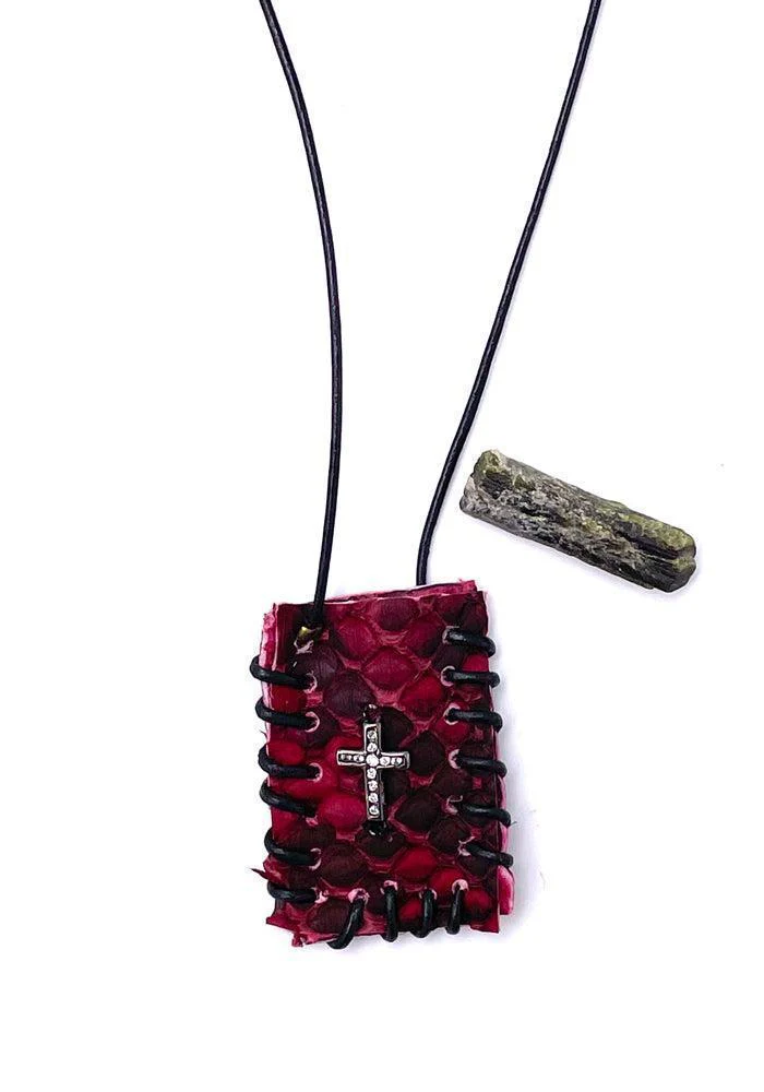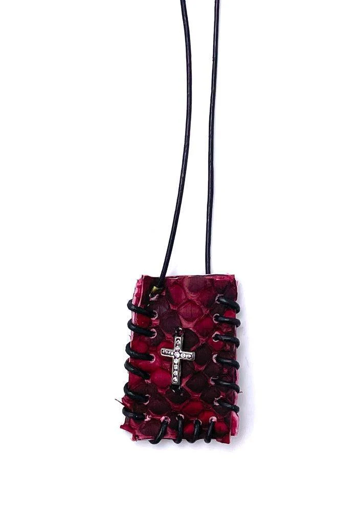 Sautoir Arizona en cuir noir et rouge avec une pampille motif croix en argent et strass