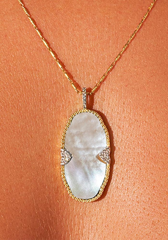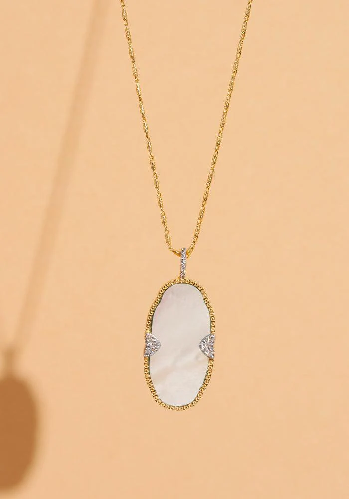 Sautoir Belize avec une chaine en laiton doré à l’or fin avec une nacre ovale et des zircons.