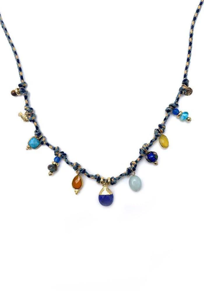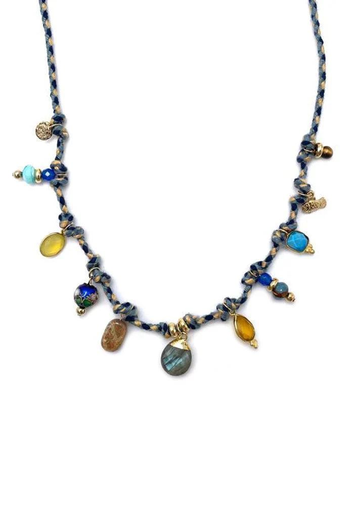 Collier Bianca en cordon, 11 pampilles dont 1 pendentif plaqué or, des pierres et une main de Fatma.