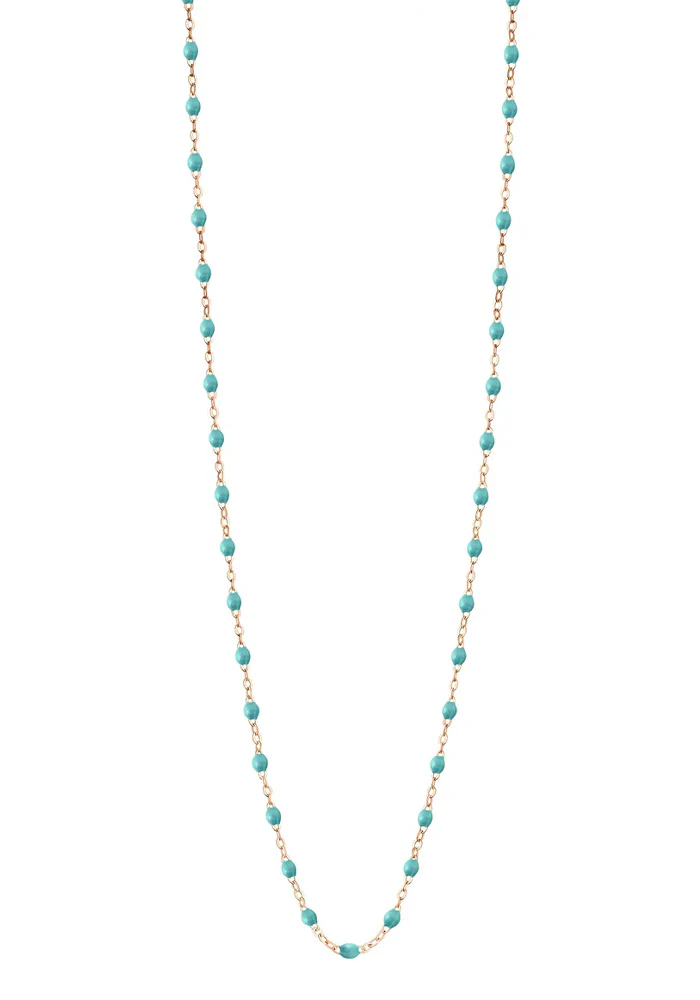 Sautoir classique Gigi en 86cm or rose et résines turquoise vert.