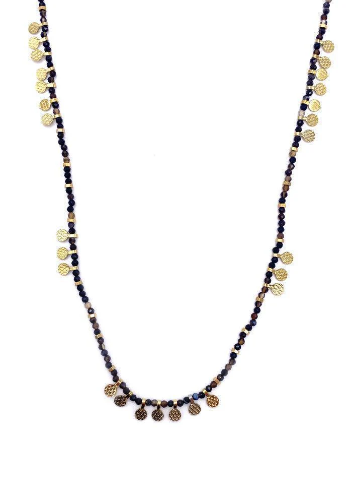 Sautoir Lara avec des perles en pierre et des pastilles martelées en acier jaune.