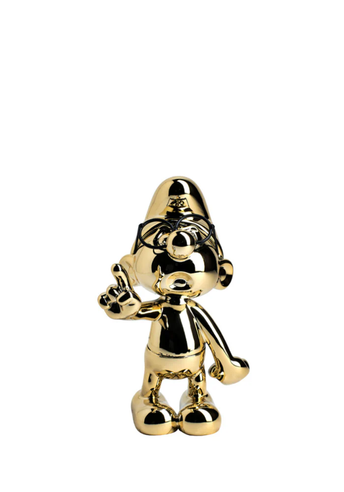 Édition limitée Figurine Schtroumpf À Lunettes chromé doré. Le Schtroumpf est debout et pointe son doigt devant lui en ayant la bouche ouverte, comme s’il avait une question.