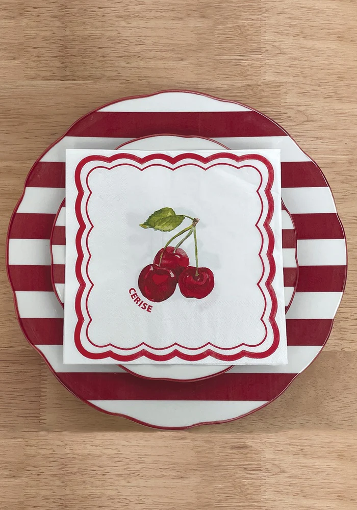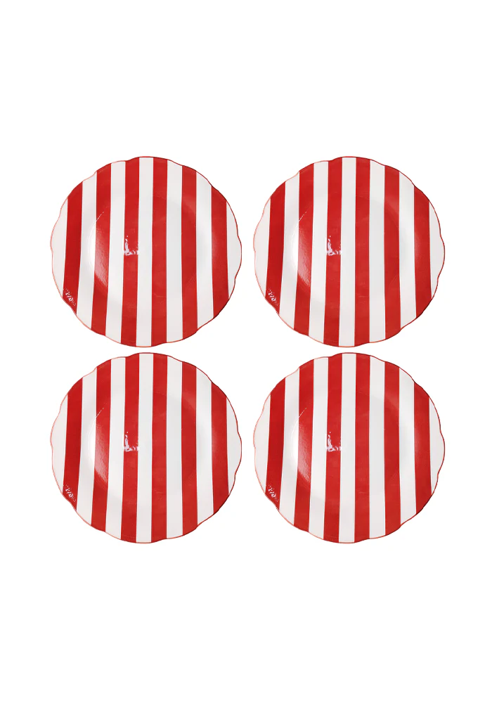 Set de 4 assiettes Trattoria en porcelaine avec des lignes rouges.