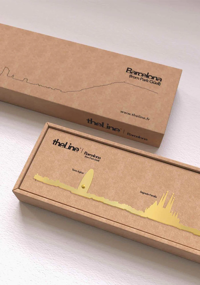 Skyline murale Barcelone en acier doré de 50cm. On y voit la Tour Agbar, la somptueuse Sagrada Familia et le Montjuïc.