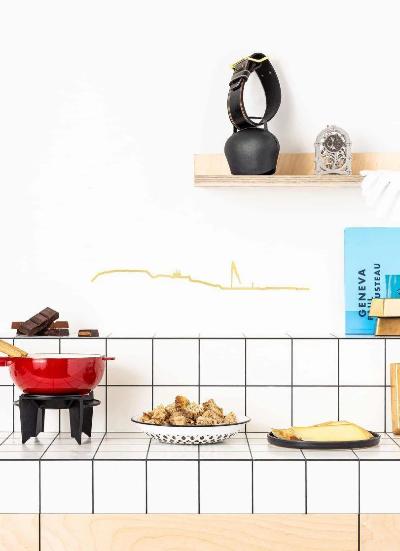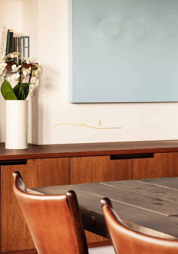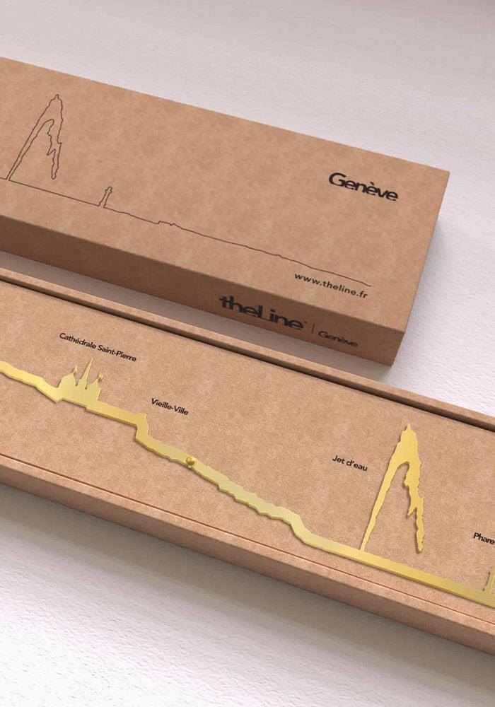 Skyline murale Genève en acier doré 50cm. On y voit la vieille ville, le jet d’eau, la Cathédrale Saint-Pierre et le phare des Pâquis.