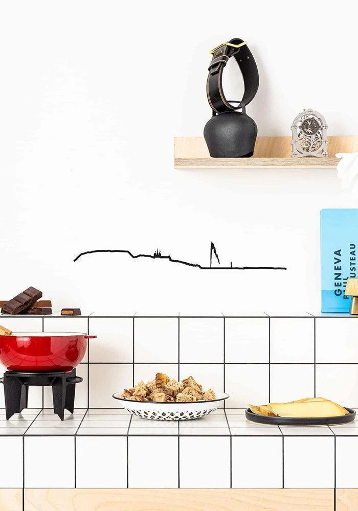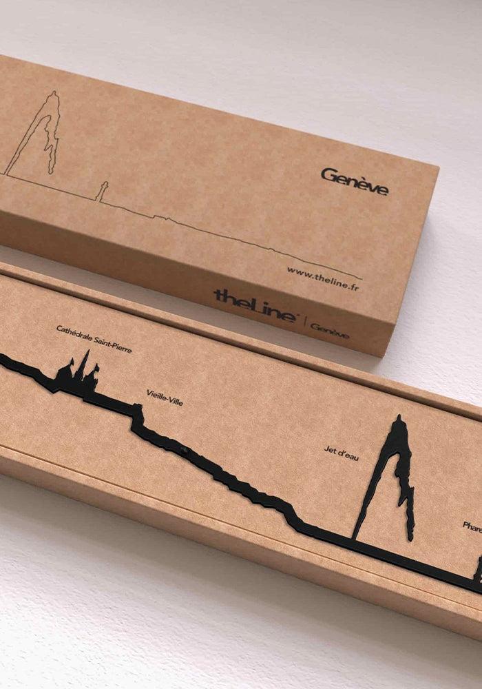 Skyline murale Genève de 50 cm en acier noir. On y voit la vieille ville, le jet d’eau, la Cathédrale Saint-Pierre et le phare des Pâquis.