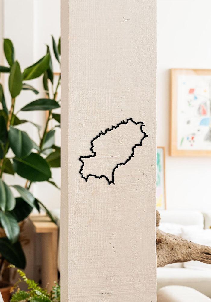 Silhouette murale de Ibiza vu du ciel en acier noir. On y voit d’Ouest en Est et du Nord au Sud, entre autre : Es Cubells, Ibiza, Es Canar, Es Figueral et le Port de Sant Miquel.