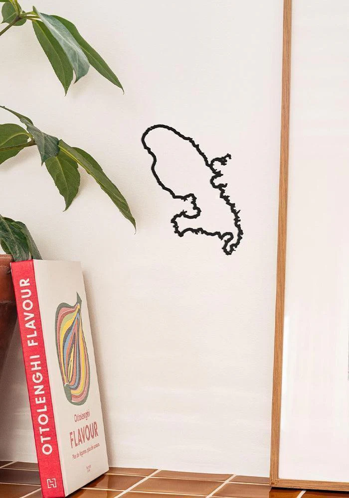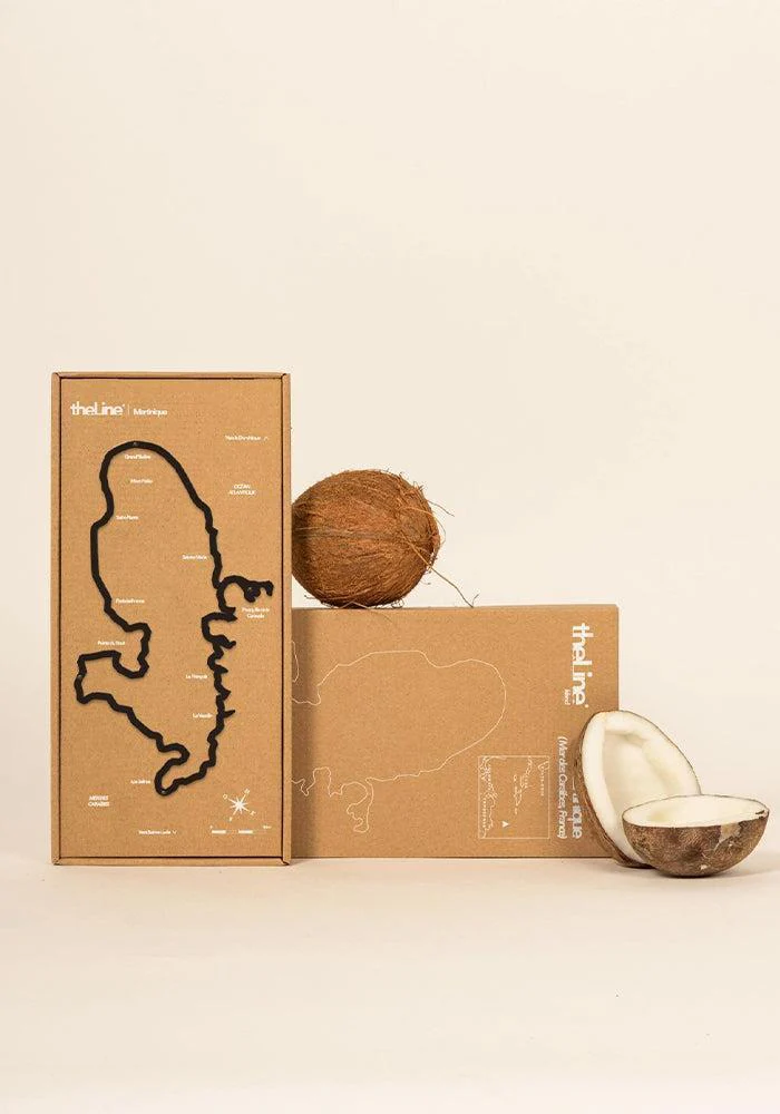 Silhouette murale de Martinique vue du ciel en acier noir. On y voit du Nord au Sud : Grand’Rivière et le Mont Pelée, la Presqu’Île de la Caravelle et la capitale Fort-de-France, la Pointe du Bout et enfin Les Salines.