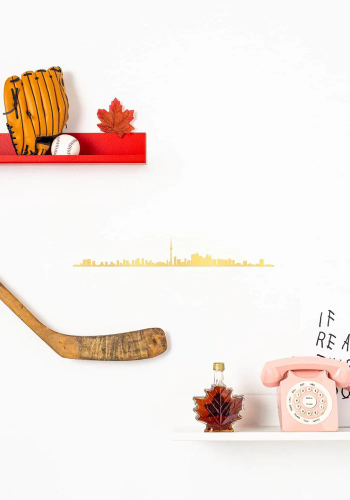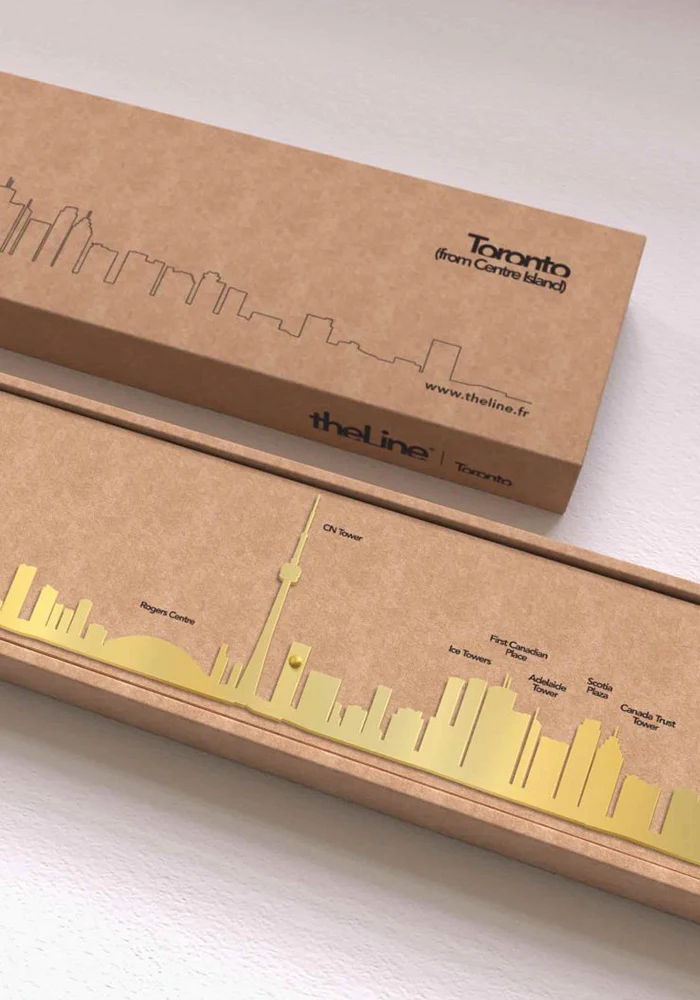 Skyline murale Toronto en acier doré. Représentation de la silhouette de Toronto depuis Center Island. On y voit le First Canadian Place, le Centre Rogers stadium et la CN Tower.