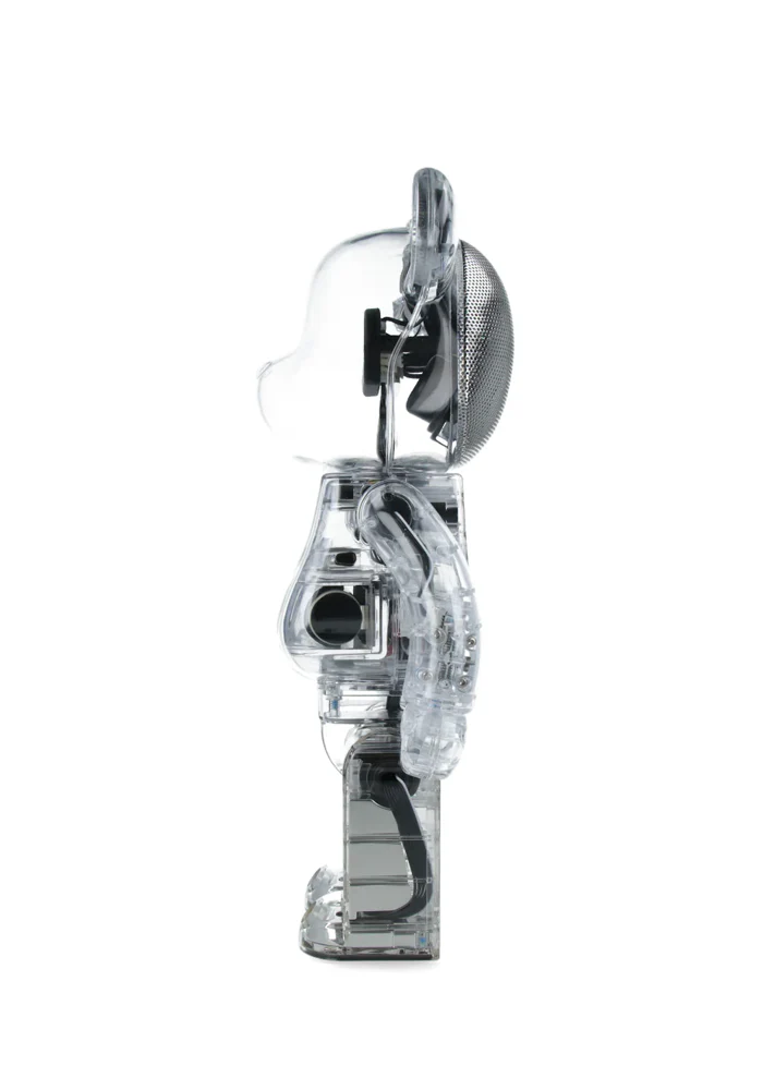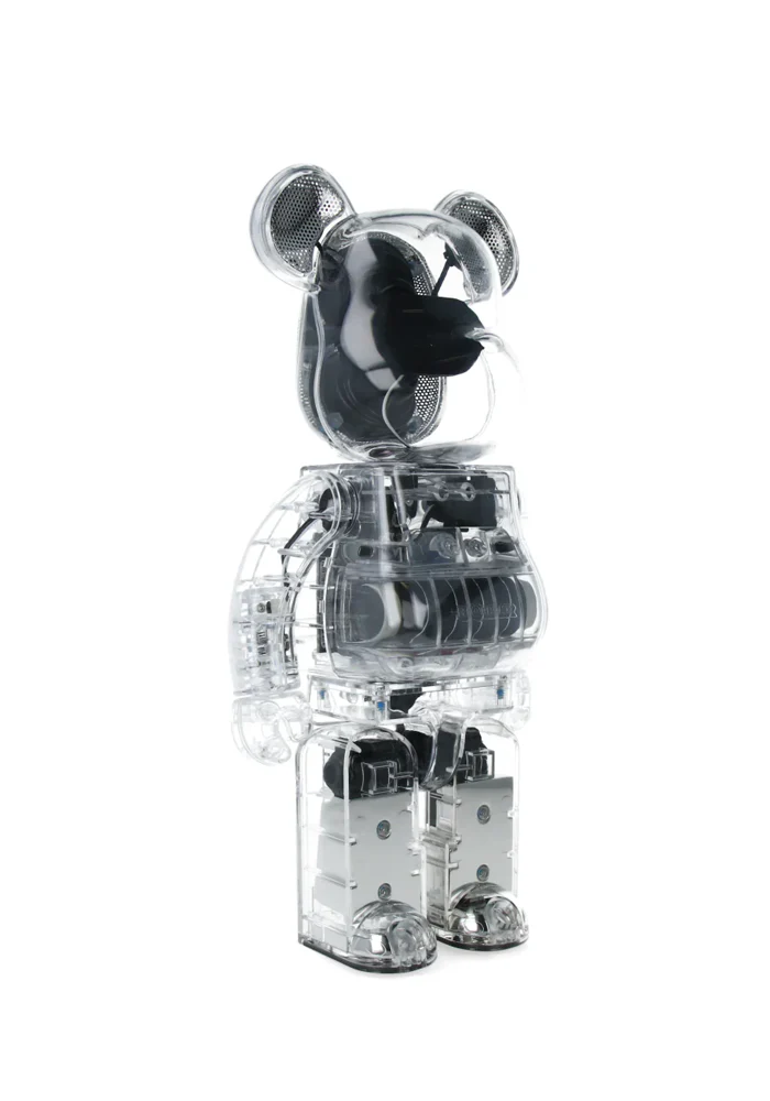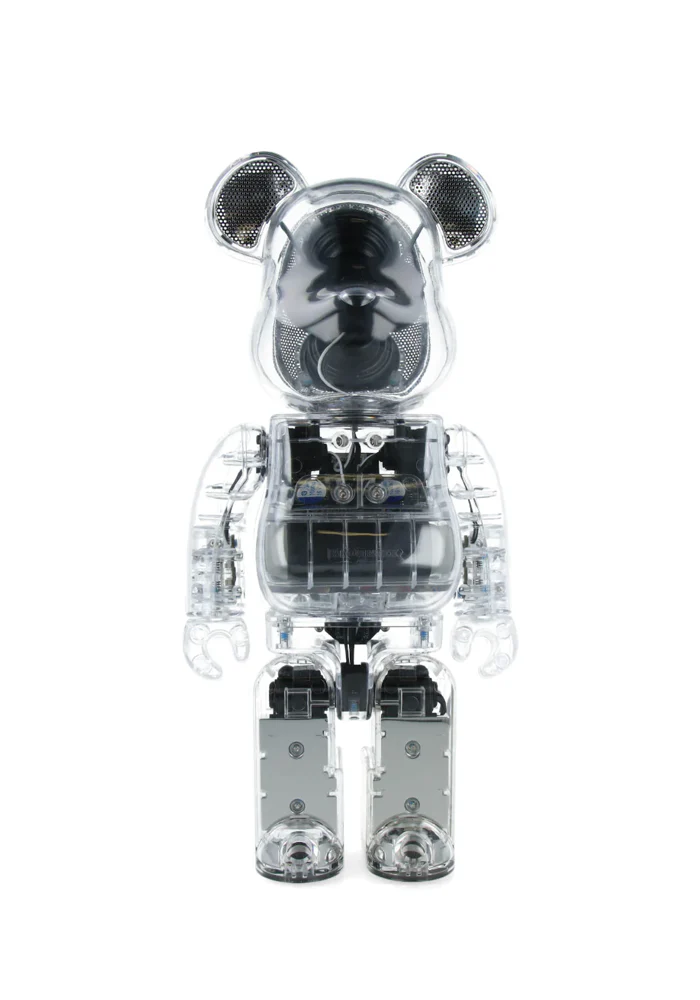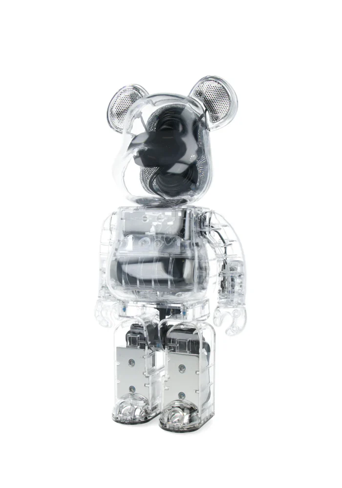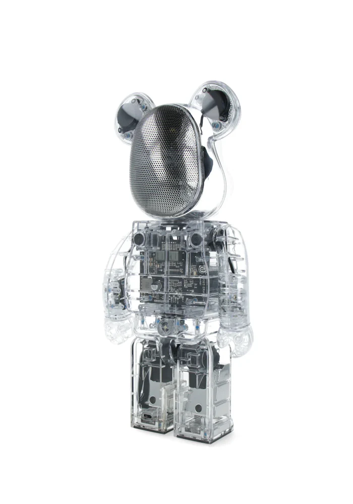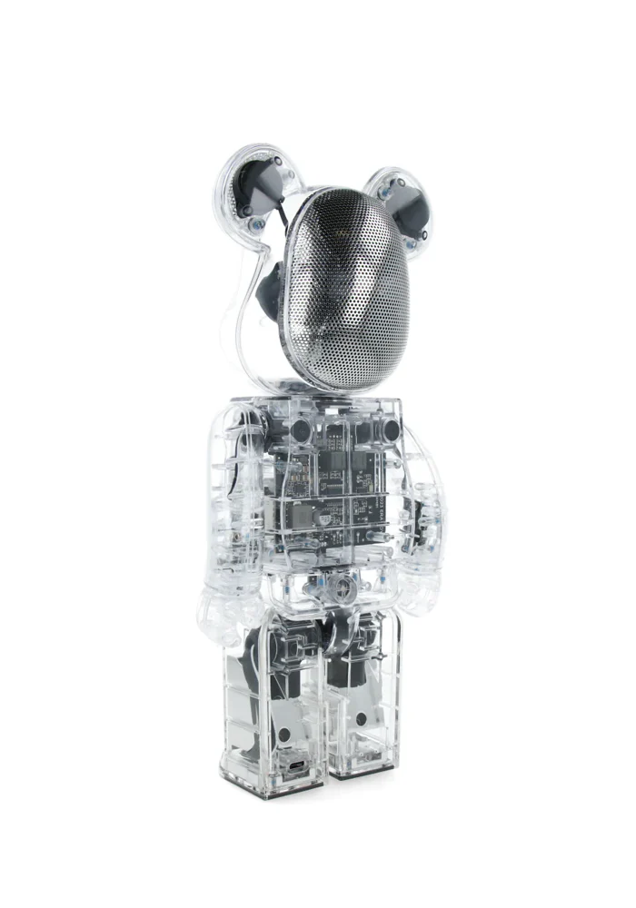 Statue Bearbrick Portable Speaker Rinaro avec une enceinte intégrée et la statue transparente.