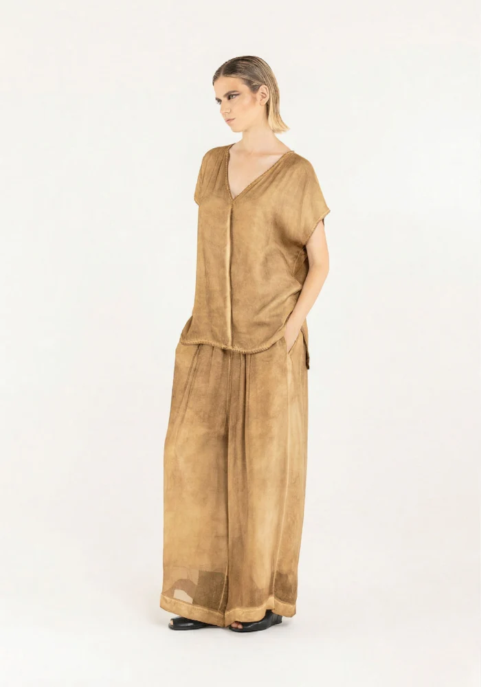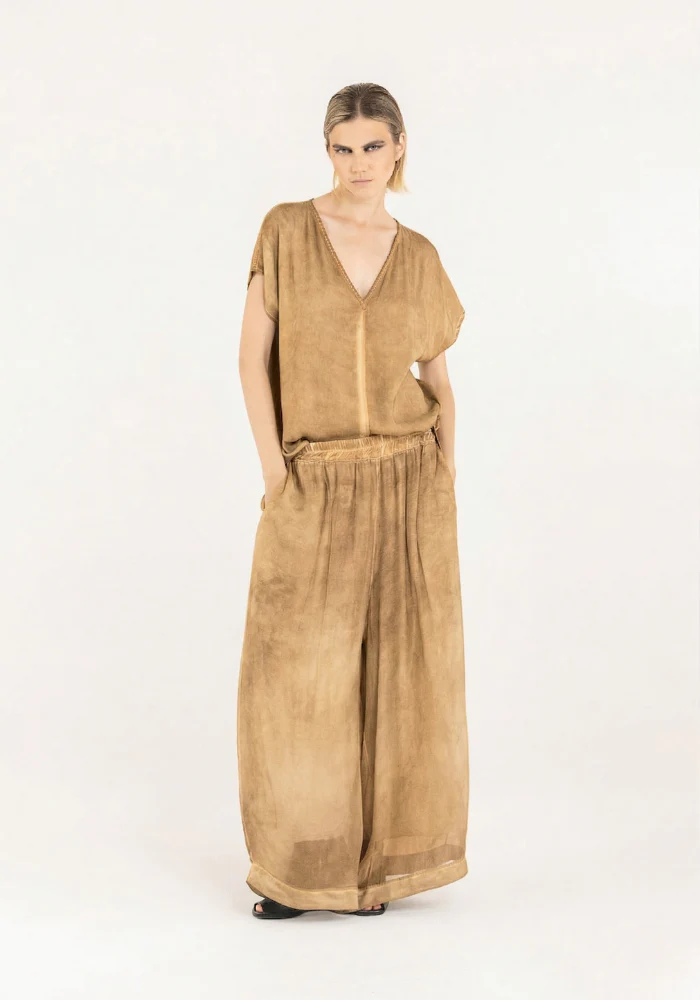 Caractéristiques : Matières : Découpe centrale en satin de viscose Jersey de viscose dans le dos Teint à froid Col V Fabriqué en Italie