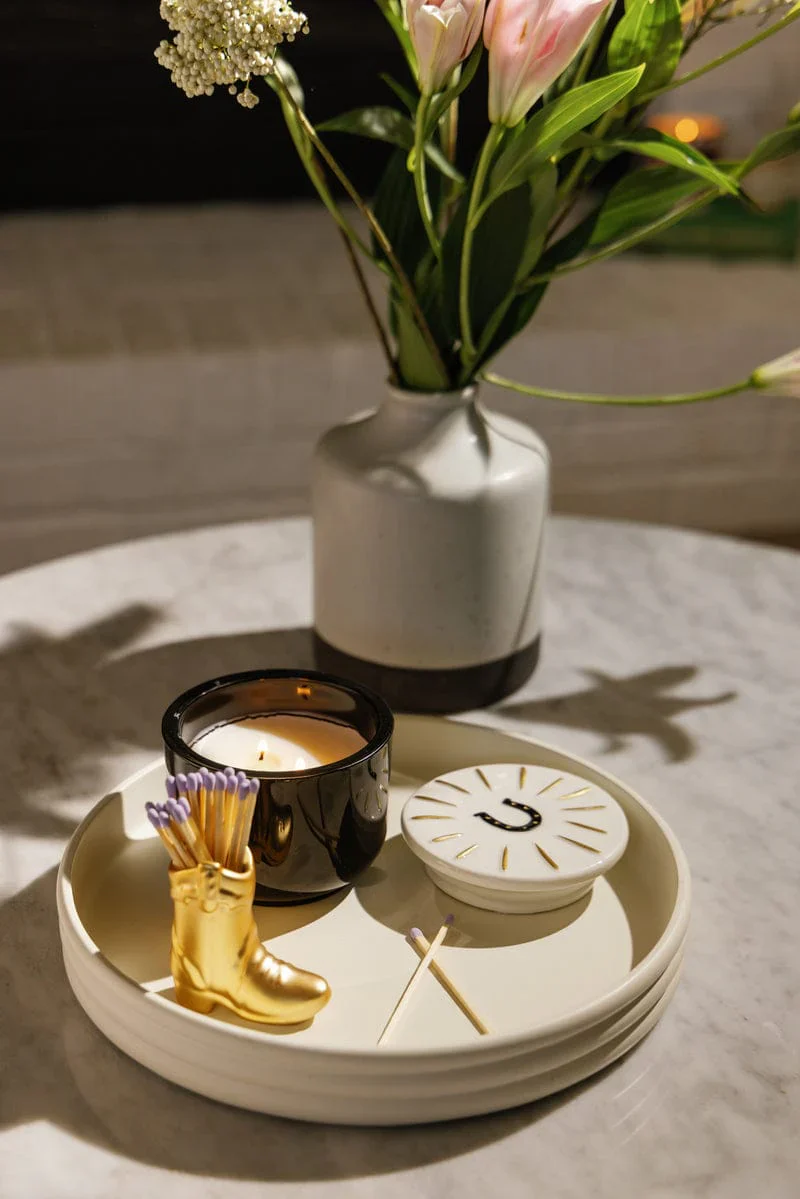 Bougie en verre « Fer à cheval porte-bonheur » Tabac et Pin 227 g avec couvercle en céramique L’alliance parfaite entre chance et design audacieux. Ce flacon élégant en verre noir est surmonté d’un couvercle en céramique peint à la main en forme de fer à cheval, apportant une touche de modernité et de charme […]