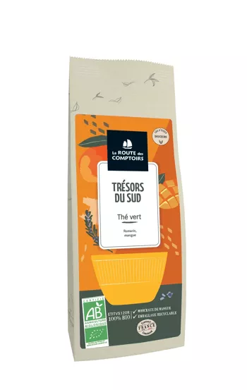 Thé vert TRESORS DU SUD – P’tites douceurs – Romarin, mangue, rhubarbe – Sachet de 100g