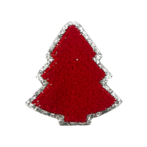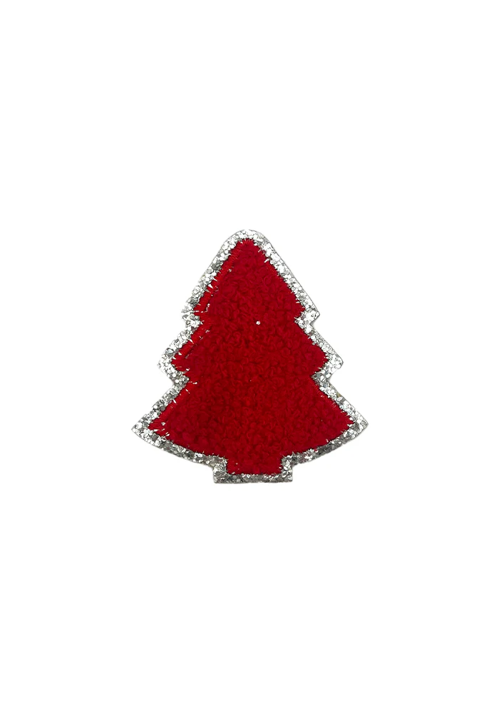Thermocollant Columbia en forme de sapin dans un tissu bouclette entouré de paillettes argentées. Ce patch peut être placé la pochette personnalisable de votre choix !