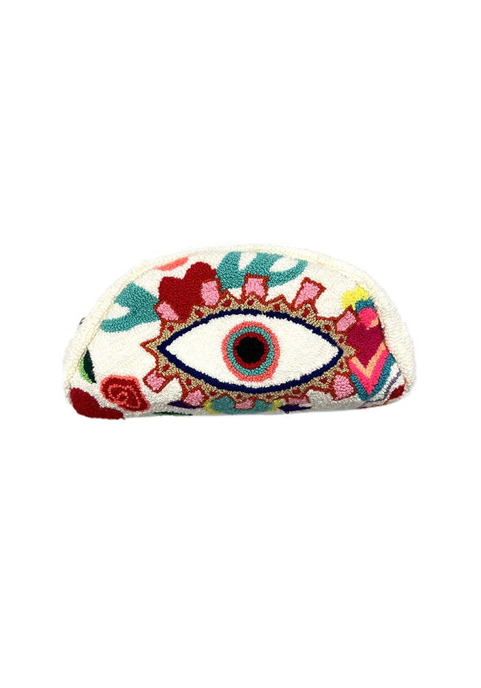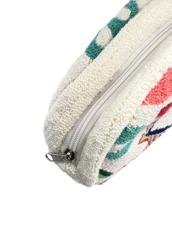 Trousse de maquillage arrondie fabriquée au Venezuela avec un motif multicolore.